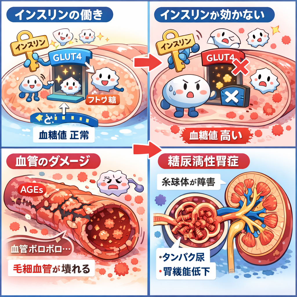 その高血糖が長く続くと、細い血管が少しずつ傷み、特に腎臓の糸球体に負担がかかります。